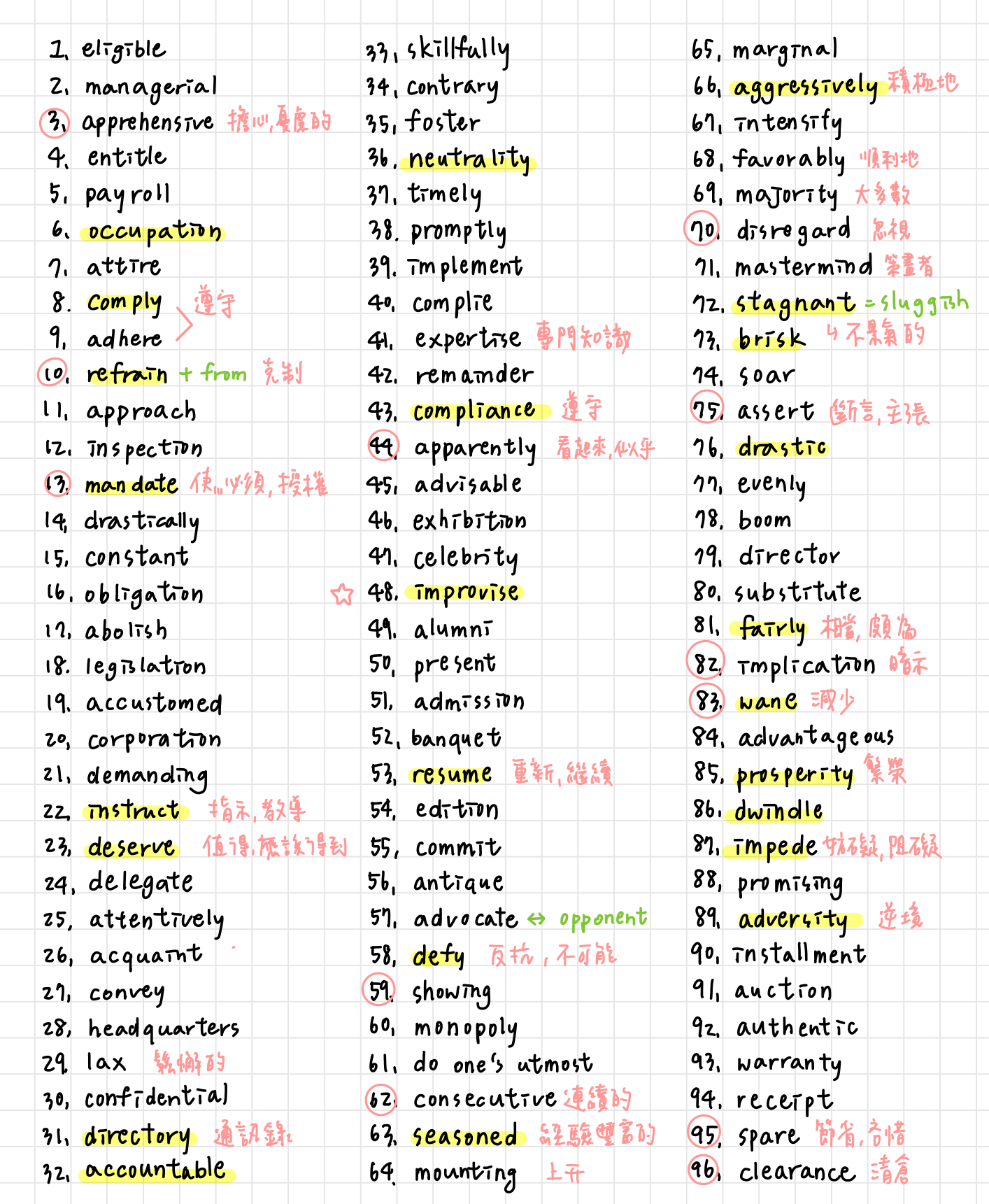 - 我只會寫下編號&英文單字,後面的中文是考前一天才寫上的