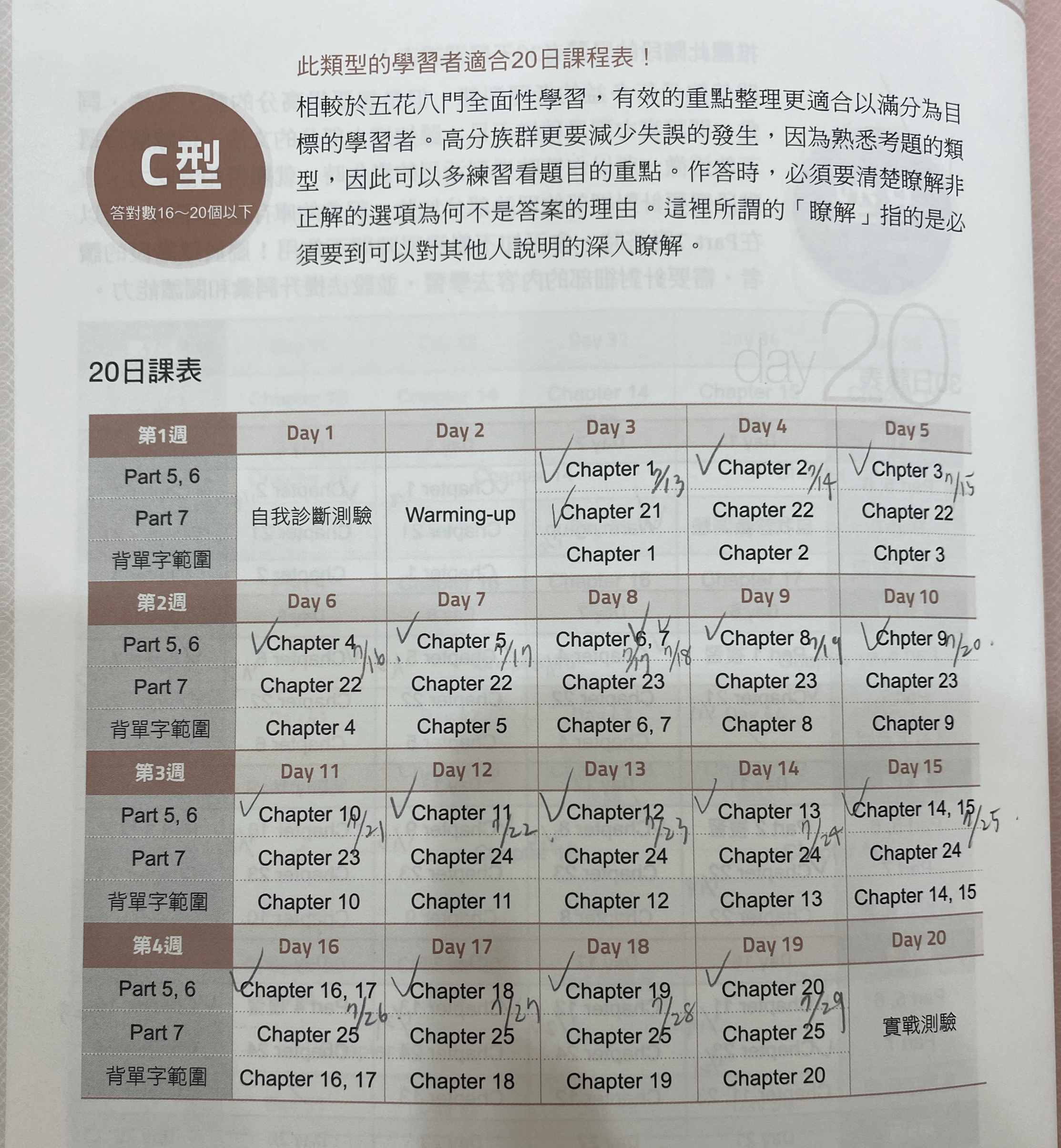 我真的依照他上面規劃的進度連續20天完成,每天完成後我就會在上面寫下日期&打勾✅